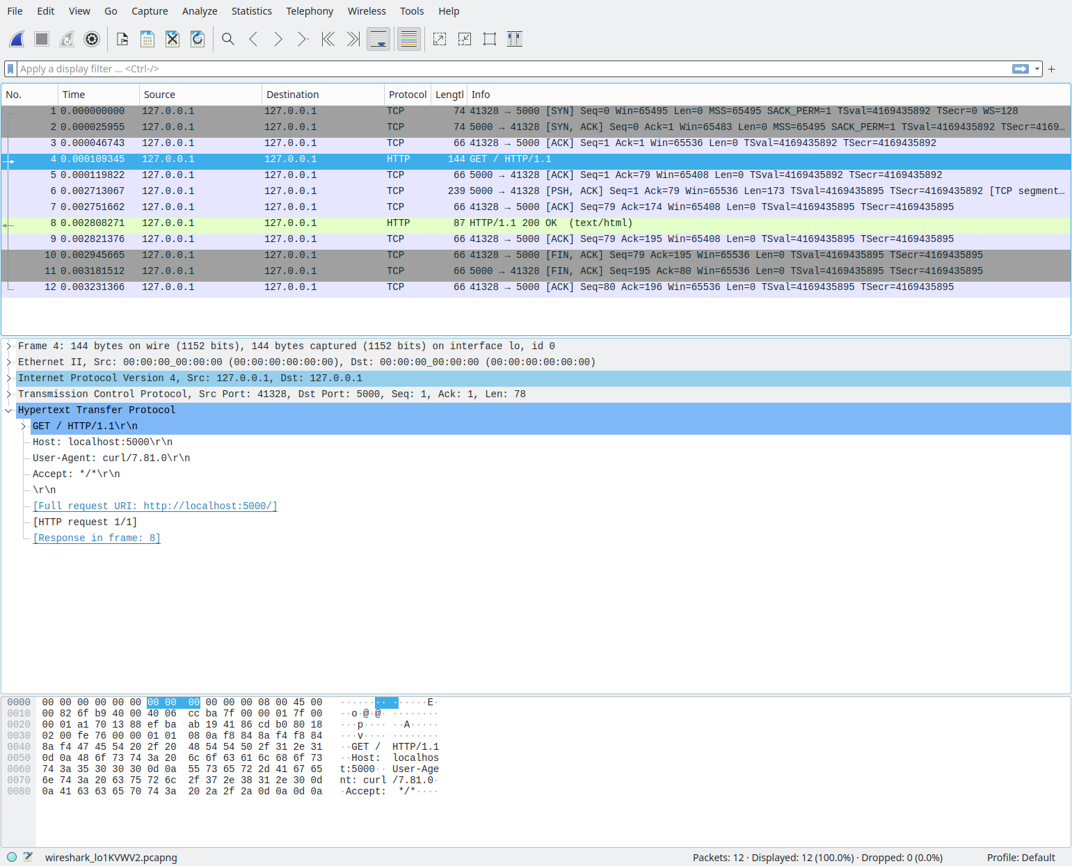 Wireshark is a network protocol analyzer that allows you to capture and inspect network traffic in real-time. You can use Wireshark to monitor HTTP requests and responses between clients and servers, and analyze the data being transferred over the network. ** Wireshark is mostly used by advanced users and network administrators as it provides low-level details such as packet headers and payloads, which is mostly unnecessary for regular web development tasks. However, it can be useful for diagnosing network issues such as network connection issues, latency, and packet loss.